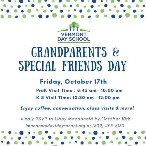 We are looking forward to Grandparent and Special Friends Day on Friday, October 17. This annual event is a wonderful opportunity for Grandparents and Special Friends to spend time with their Grandchildren & Special Friends in the classrooms, enjoy coffee, and visit classrooms! Please see the invite below and be sure to RSVP to Libby Macdonald by October 10 to attend this event (lmacdonald@vtdayschool.org).